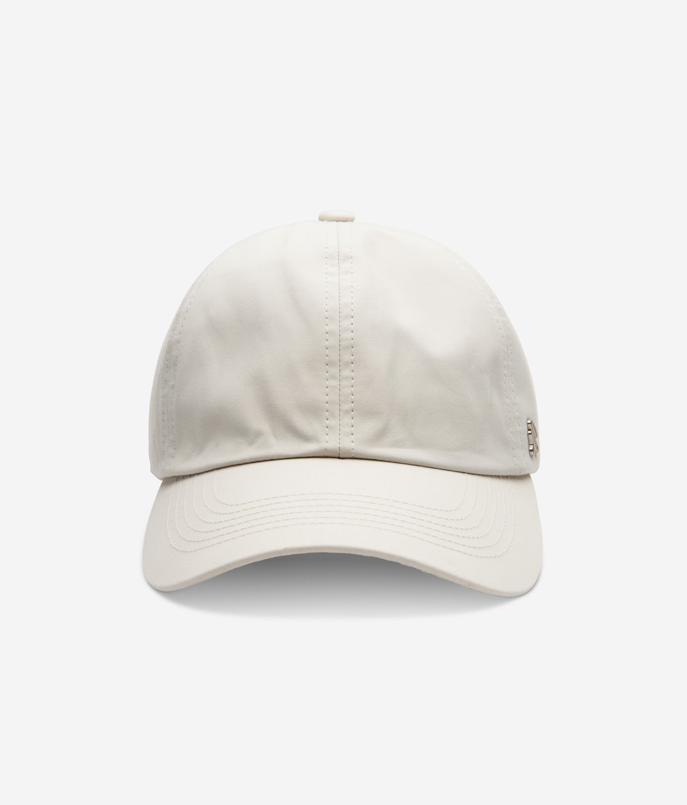 White Stone Ventile dad cap side view with curved brim and metal logo detail